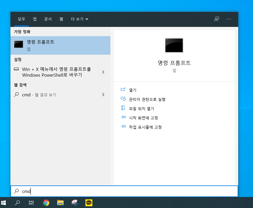 검색창에서 cmd라고 작성하면 명령 프롬프트가 나오게 됩니다. 여기를 클릭합니다