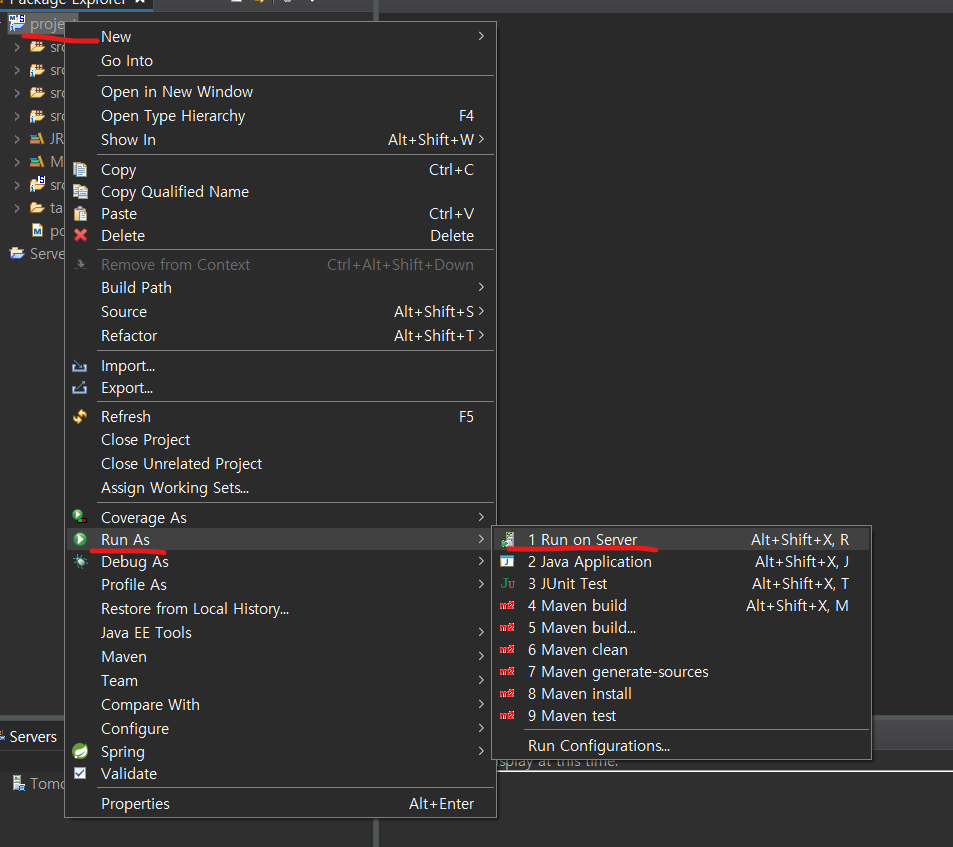프로젝트에서 우클릭하고 run as에서 run on server를 눌러줍니다.