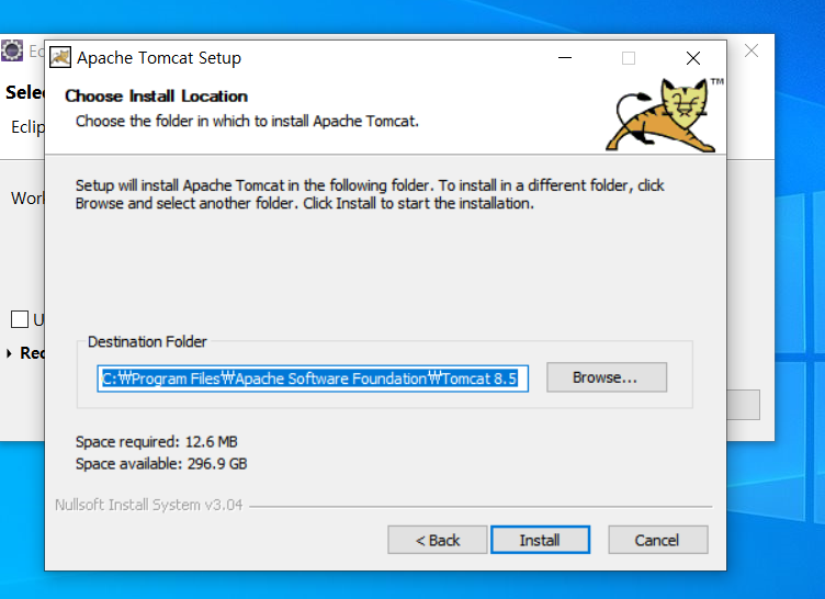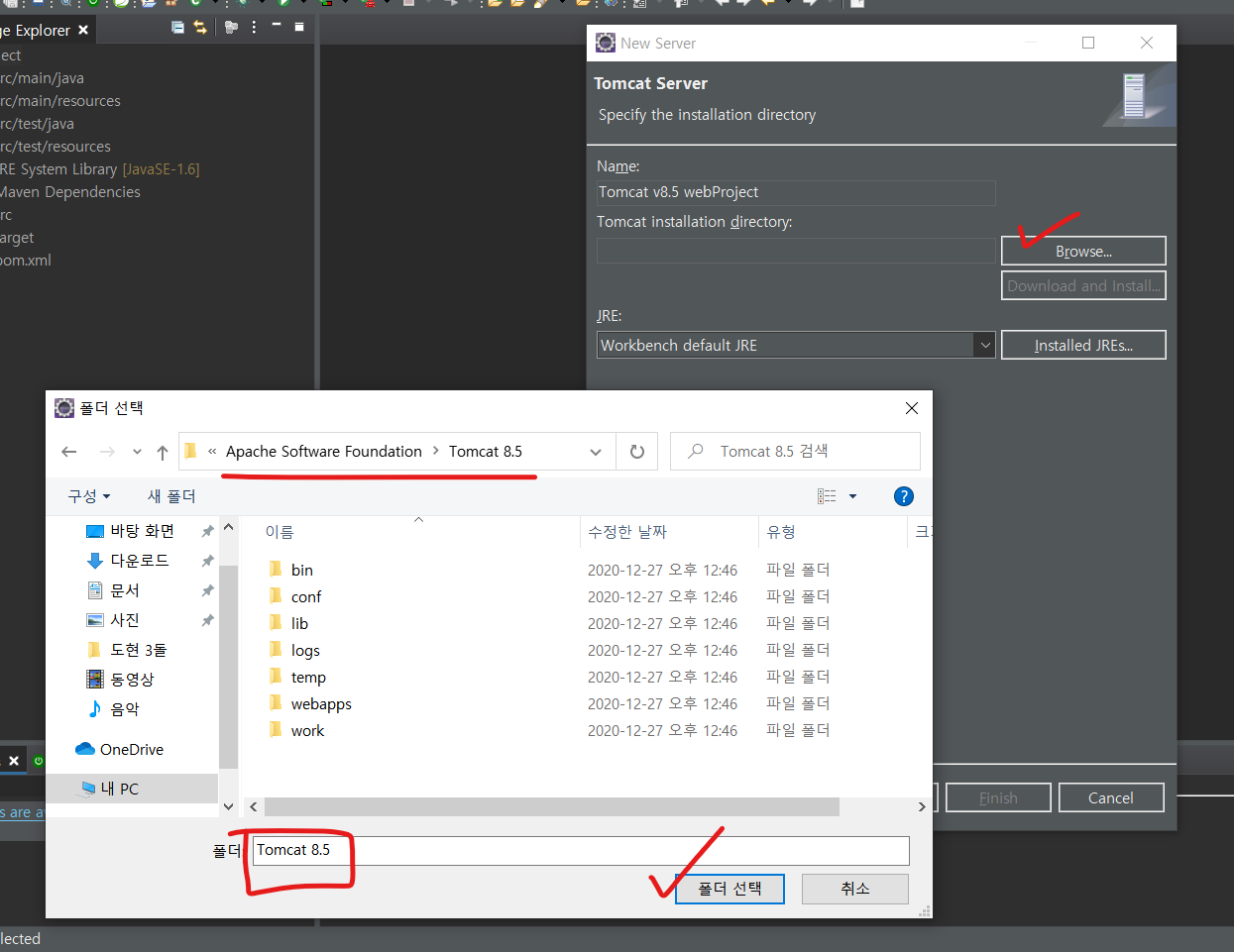 그리고 조금 전에 우리가 설치하였던 톰캣 8의 폴더 위치를 지정해준 후, 넥스트를 누룹니다.