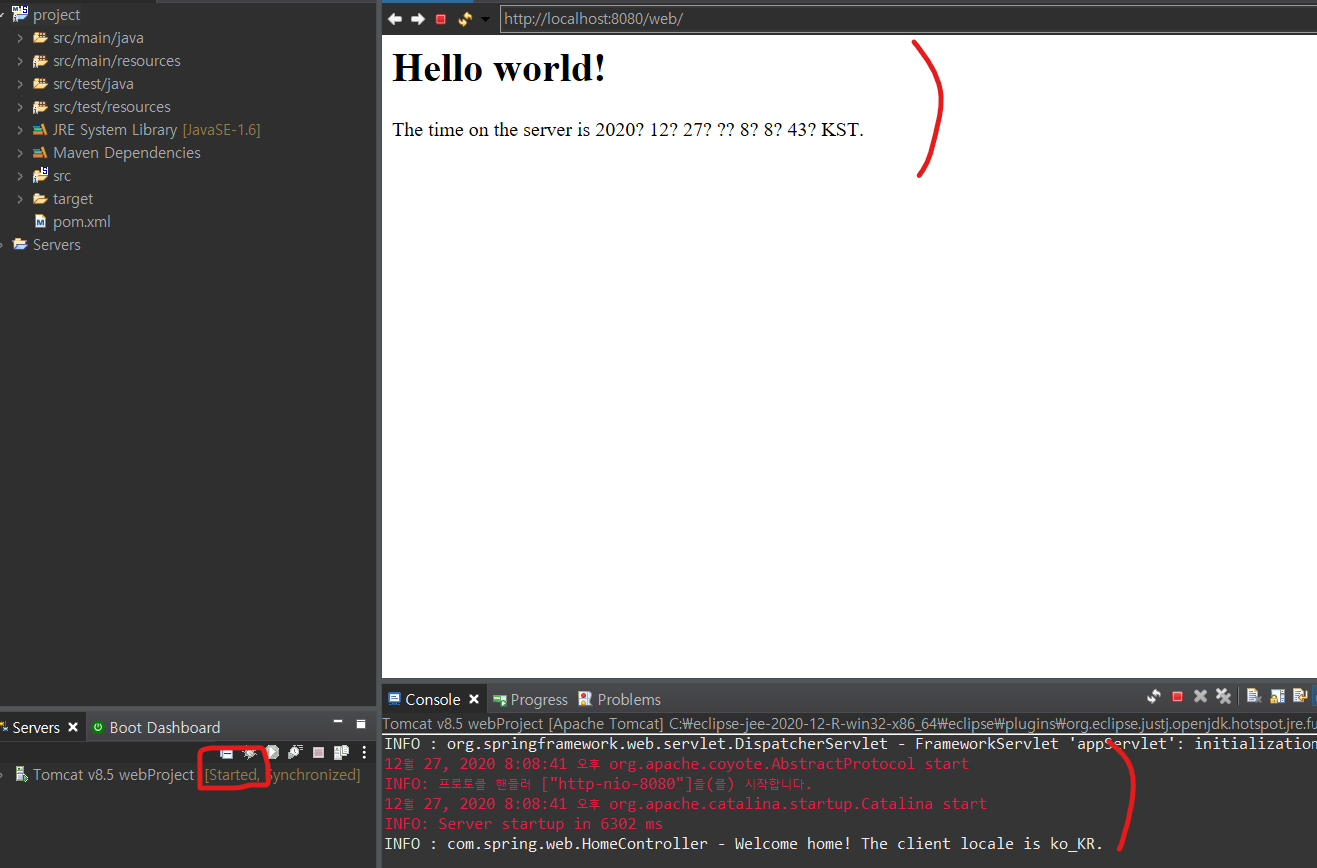 톰캣도 'started'로 뜨면서 동작하고 있는걸 확인할 수 있습니다.
