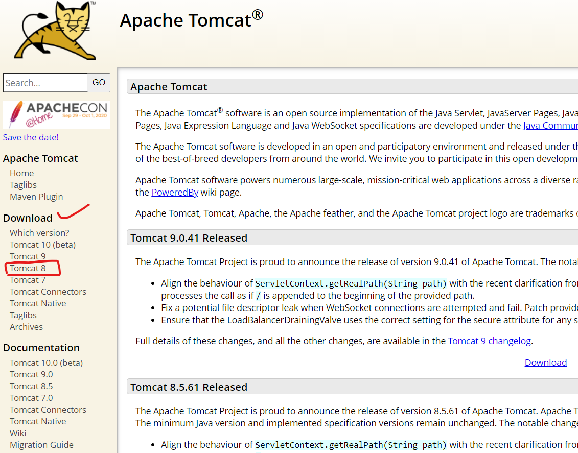 그리고 다운로드에서 톰캣8을 클릭합니다.