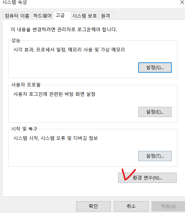 윈도우 검색창에 '고급'이라고 치면 고급 시스템 설정 보기가 뜨게 됩니다.