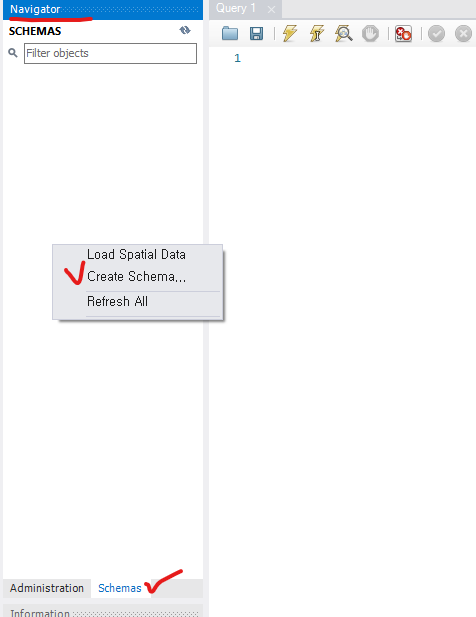 Navigator 아래 스키마를 클릭하신 다음, 우클릭을 눌러 스키마를 생성합니다.
