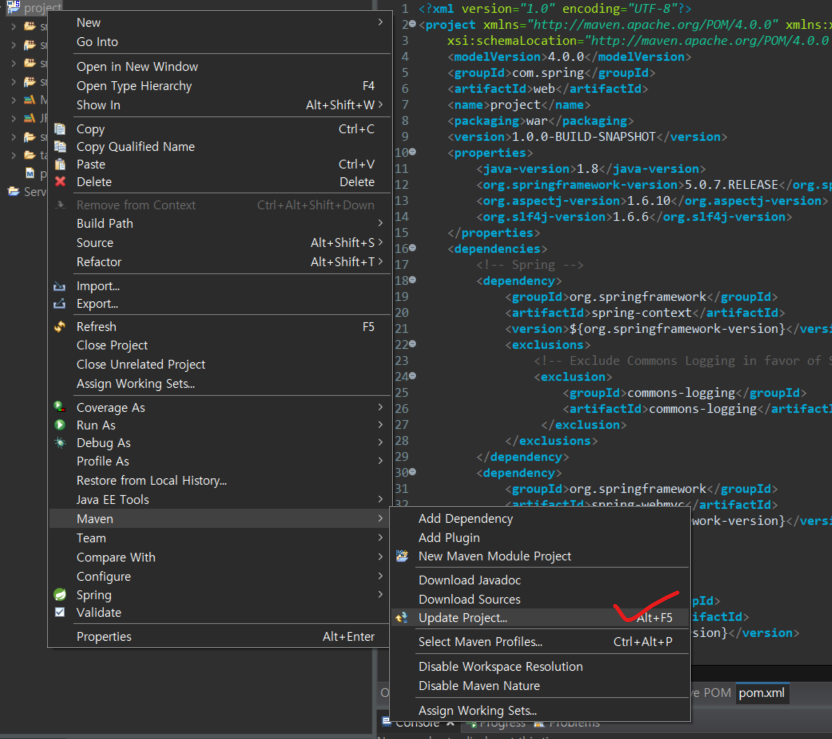 프로젝트 우클릭으로 메이븐에서 업데이트 프로젝트를 해줍니다.