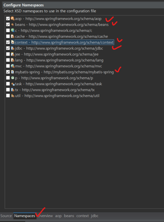 네임스페이스에서 mybatis를 추가합니다.