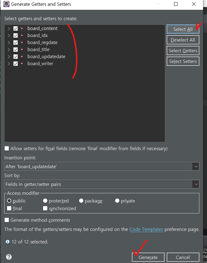 select all을 누르면 컬럼들 체크란에 체크가 되게 됩니다. 그리고 generate을 누르면 getter/setter가 완성이 됩니다.