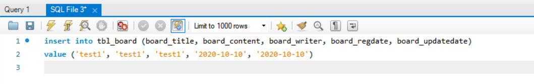 insert into tbl_board (board_title, board_content, board_writer, board_regdate, board_updatedate)
