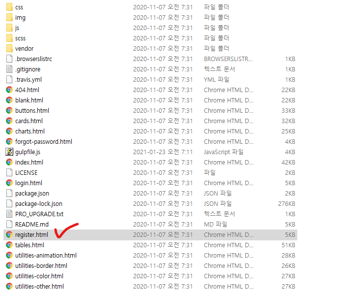다행이도 지난 번 받았던 부트스트랩 파일안에 register.html 파일에 우리가 원하던 등록화면이 있습니다.