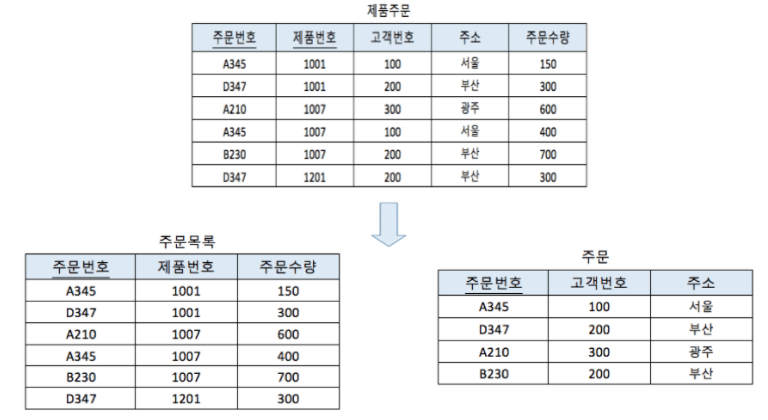 - 기본키(주문번호 컬럼)이 제품번호에 의해 결정될 수 있기때문에 분해를 해야합니다.