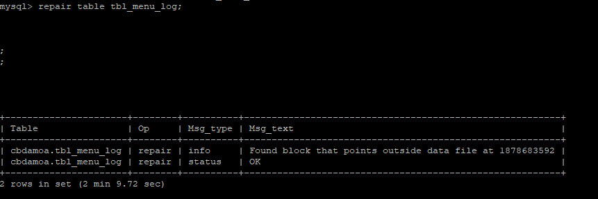 예) repair table tbl_menu_log;