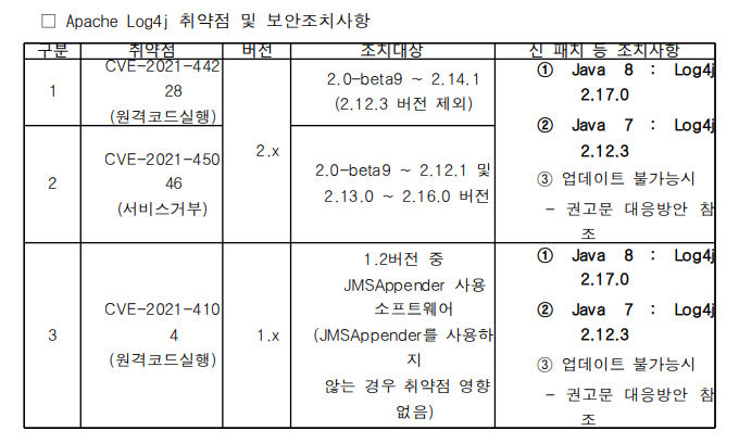 2021년 12월 17일 Apache Log4j 취약점 보안조치사항입니다.
