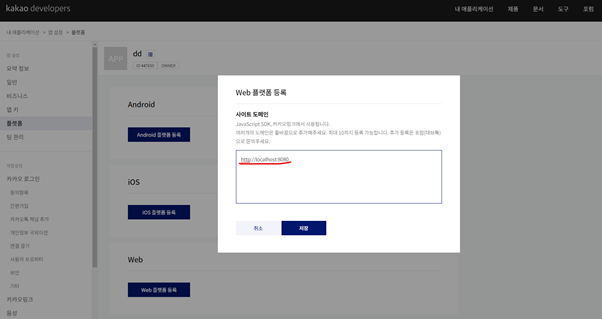 플랫폼을 등록하면 우선 개발자사이트에서는 모든 작업이 완료되었습니다!