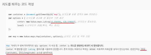 이 위도와 경도를 코드에 넣어주면 지도가 나타나게 됩니다.