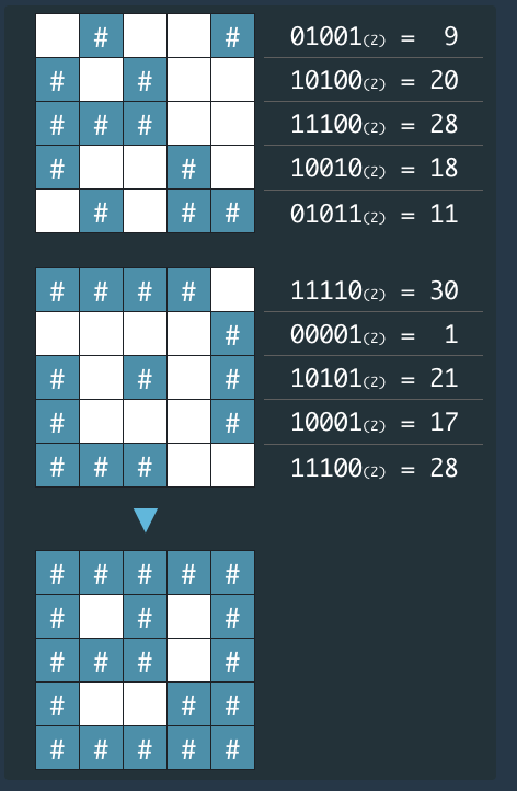 - 암호화된 배열은 지도의 각 가로줄에서 벽 부분을 1, 공백 부분을 0으로 부호화했을 때 얻어지는 이진수에 해당하는 값의 배열이다.