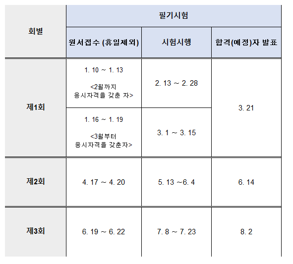 | ○ 원서접수 시간 : 원서접수 첫날 10:00부터 마지막 날 18:00까지임 ○ 원서접수 분산 및 유의사항 - 기사․산업기사․서비스 - 기사 제1회 필기시험 원서접수는 ① 1. 10∼1. 13(2월까지 응시자격을 갖춘 자) 2월 시험시행, ② 1. 16∼1. 19(3월부터 응시자격을 갖춘자) 3월 시험시행에 따라 구분하여 접수하며 - 응시자격기준일(시험일)을 고려하여 기사 제1회 필기시험은 수험자의 학적 변동․경력 등 응시자격 충족여부를 확인 후 원서접수 시 시험일을 선택하시기 바람 ○ 필기시험 합격(예정)자 및 최종합격자 발표 시간: 해당 발표일 09:00 ○ 기술사, 기능장, 기사, 산업기사, 서비스(해당종목) 필기시험 합격예정자는 당회 응시자격 서류제출 기간 이내에 응시자격 서류를 제출하여야 하며, 제출하지 않을 경우 필기시험 합격이 무효처리 됨 - 다만, 외국 발급서류 첨부의 사유로 기간 내에 제출할 수 없는 경우 수험자 본인 신청에 의해 응시자격 증명서류 제출을 최종 합격자 발표 7일 전까지 연장할 수 있으며, 이 경우 해당 회차 실기시험 응시 불가 ○ 종목에 따라 시행 일정이 다를 수 있으므로 해당 종목의 등급별․회별 시행종목 현황을 반드시 사전에 확인하시기 바람 ○ 천재지변, 감염병 확산, 응시인원 증가 등 부득이한 사유가 발생 된 경우 검정시행 기관장이 시행 일정을 조정할 수 있음 ○ 주관식 필기로 시행하는 실기시험(필답형 실기시험)은 실기시험이 시작되는 첫번째 토요일 또는 일요일에 전국 동시 시행 - 토요일: 기능장 제74회, 기사(산업기사·서비스) 제2회·제3회, 기능사 제2회·제3회 - 일요일: 기능장 제73회, 기사(산업기사·서비스) 제1회·제4회, 기능사 제1회·제4회 * 단, 산업수요 맞춤형고등학교 및 특성화고등학교 등 필기시험 면제자검정은 시험이 시작되는 첫 번째 평일 시행 ※ 기사·산업기사(서비스분야) 필답형 실기시험은 코로나19 감염증 상황에 따라 1일 시행에서 2일 분산 시행으로 변경될 수 있고, 분산 시 시험 일정 별도 공지 |