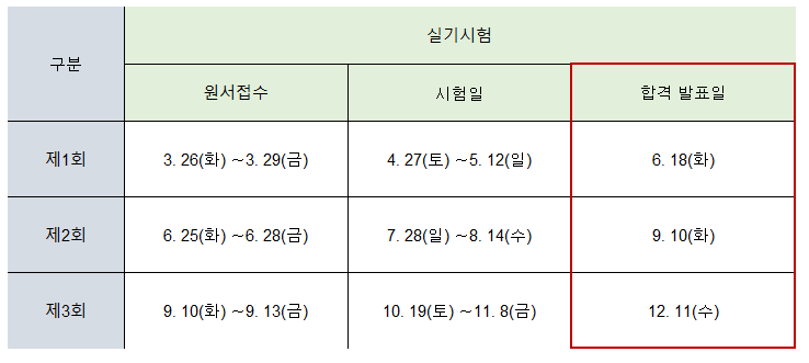 (예 - 제 1회 실기 시험기간인 4월 27일부터 5월 12일이면 4월 27일이거나 4월 28일이 정보처리기사 시험일입니다.)