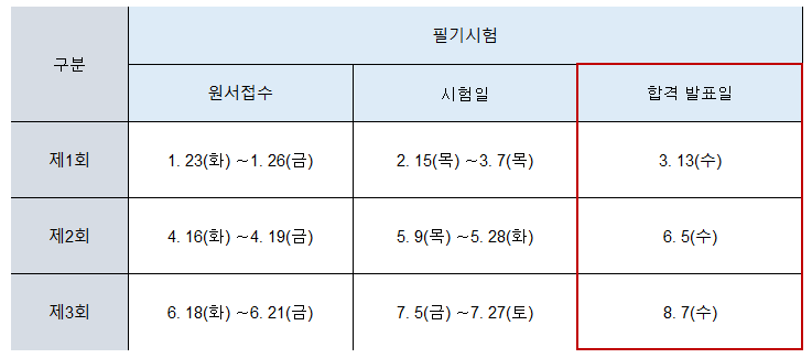 - 필기시험 합격예정자 및 최종합격자 발표시간은 해당 발표일 09:00 입니다.