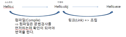 원시코드에서 목적코드(목적파일)로 바꾸어 주는 것이 컴파일이고 목적 파일을 실행파일로 바꾸는 것을 링크라고 합니다.