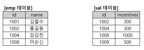 7. 다음은 SQL 문제이다. 아래 두 테이블을 참고하여 보기에 쿼리 실행 결과를 작성하시오.