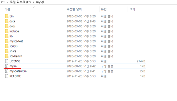 mysql 폴더에 들어가서 my.ini 파일을 아래와 같이 수정합니다!