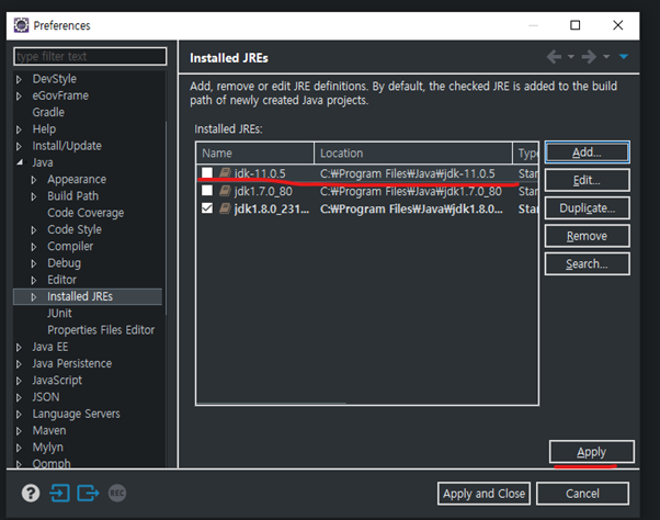 경로 : window > preferences > java > installed JREs > add > Standard VM (next) > Directory > 해당 jdk폴더 설정 > Finish