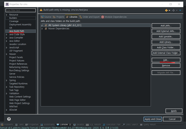 경로 : 프로젝트 우클릭> preferences > Java Build Path> 해당 JRE System Library 선택 >Edit